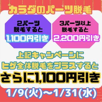 カラダのパーツ脱毛を ★2パーツすると → 1,100円引き! ★3パーツ以上すると → 2,200円引き! カラダのパーツの組み合わせは自由♪ 上記キャンペーンに ★ヒゲ全体脱毛をプラスすると ↓ さらに1,100円引き! 最大3,300円引き!! ※ヒゲパーツ、…… カラダのパーツ脱毛を ★2パーツすると → 1,100円引き! ★3パーツ以上すると → 2,200円引き! カラダのパーツの組み合わせは自由♪ ……